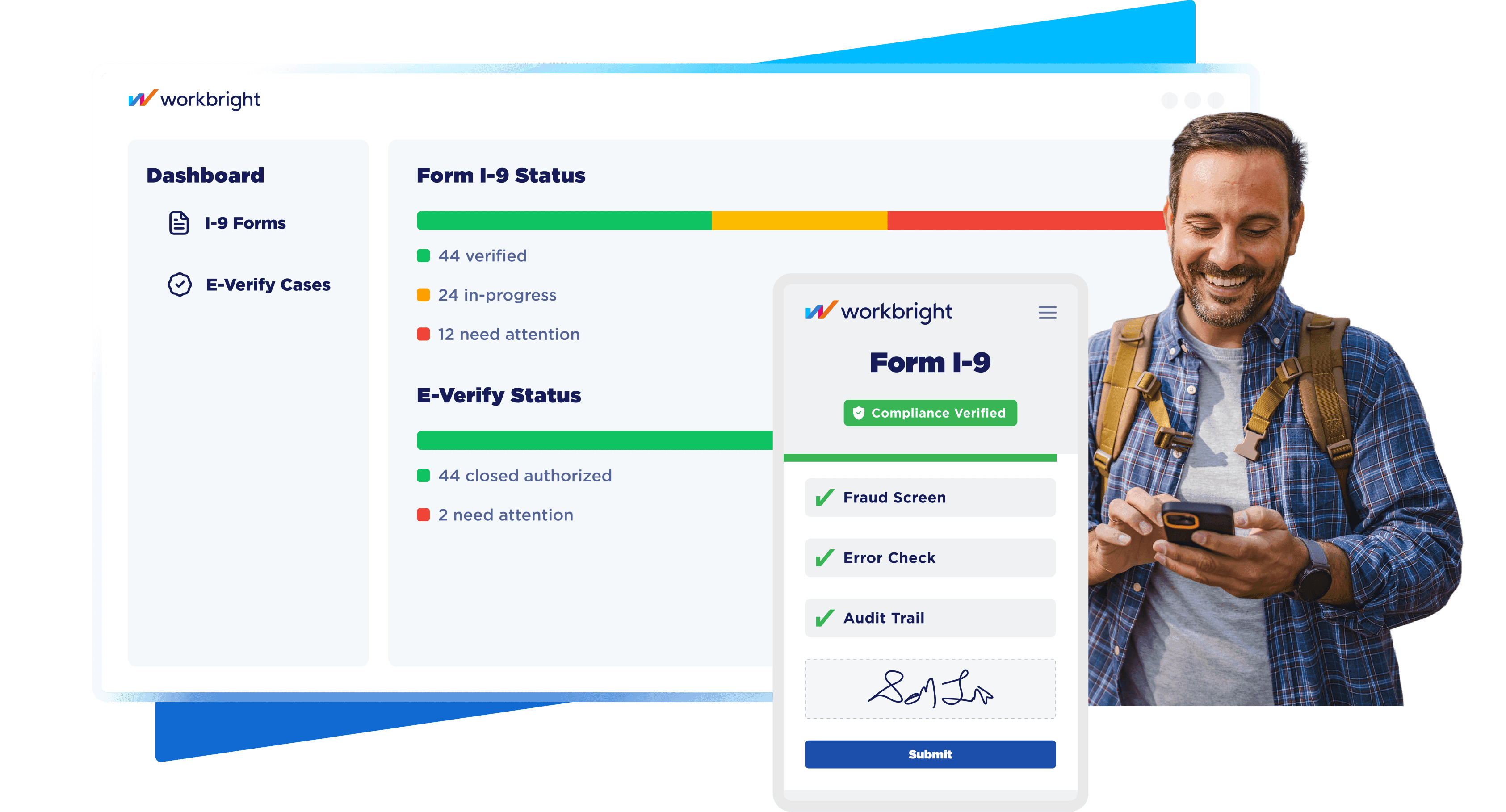 Integrate WorkBright’s I-9 for best-in-class compliance automation, with 150+ error checks and built-in document fraud detection.